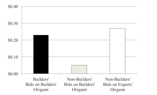 Results show participants’ willingness to pay (WTP) for origami frogs and cranes made by themselves or others. Participants saw their amateurish creations as similar in value to experts’ creations, Harvard Business School, CC BY
